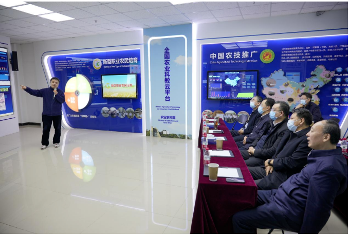 为持续推动天津市智能农业研究院工程建设,近日,市农业农村委书记、主任金汇江,二级巡视员胡伟等随市领导一行到北京市农林科学院进行考察,院党组书记吴宝新,院党组成员、副院长张闯,中国工程院院士赵春江等接待并进行座谈。现场参观了全国农业科教云大数据中心、农业信息技术与智能装备技术专题展厅、农机作业监控物联网平台,详细了解了全国农业科教云平台整体运行情况,以及种业装备、农业机器人、土壤快速检测技术等相关情况。