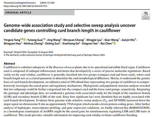 近日,市农科院生物所、蔬菜所联合华中农业大学等单位共同研究攻关,在花椰菜花球重要农艺性状调控基因挖掘方向取得重要研究进展,相关论文在中国科学院一区TOP期刊《Theoretical and Applied Genetics》(IF=5.0)发表。