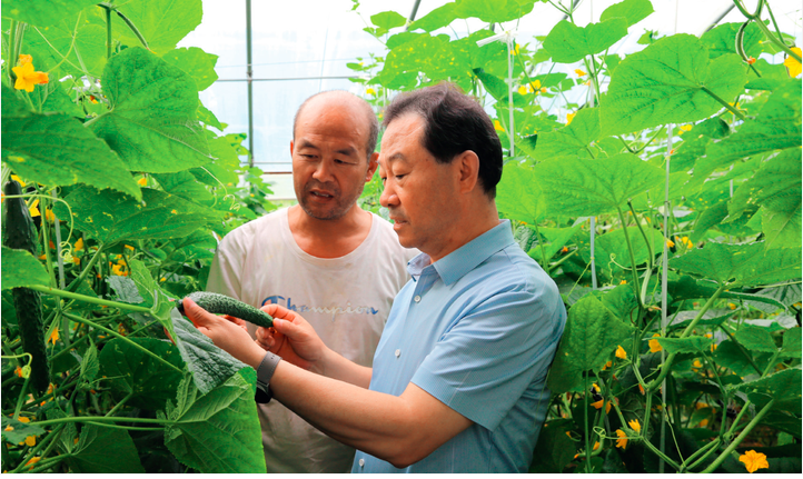▲张建树(右)在棚室指导农户种植黄瓜。(图/石扬)