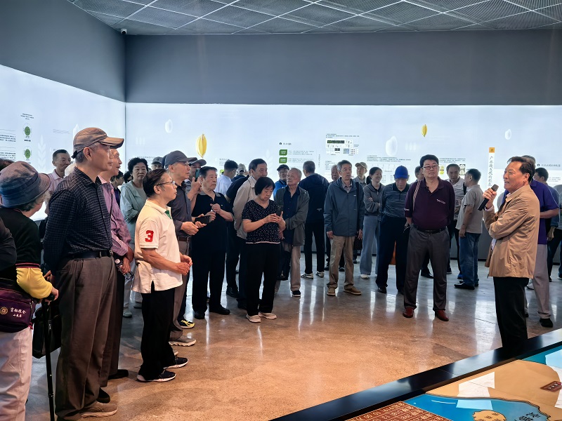在小站稻作展览馆内,3000平方米的展区串联起千年稻作脉络。老同志们在融入稻田、河流与小站练兵园元素的浮雕墙前驻足,聆听从辽宋时期辟田植稻到明代屯田开垦的历史叙事,重温李鸿章组建淮军盛字营屯垦种稻、周盛传改良盐碱地育出御米的峥嵘过往。犁铧、水车等传统农具与联合收割机、碾米机等现代设备的陈列对比,让老同志们直观感受“从人工到机械”的耕作变革,对“白里透青,油光发亮、粘香适口”的小站稻特质有了更深体悟。随后,在坐落于会馆村的天津国际水稻研究院,实地参观科研成果转化情况。