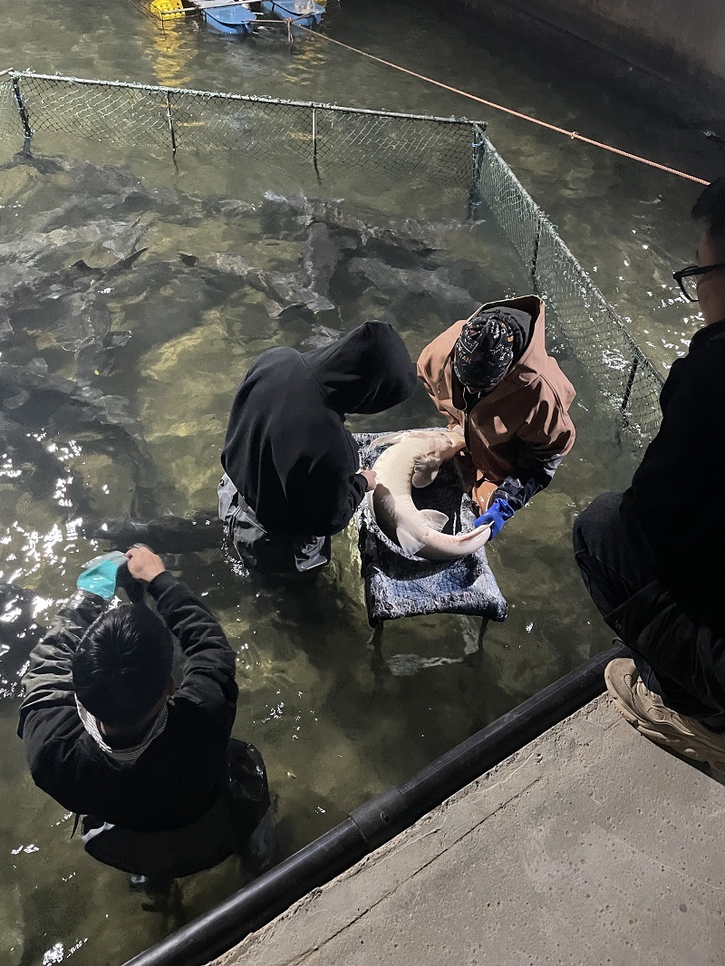 针对企业反映的鱼子酱存在卵膜薄、韧性不足、保质期短的痛点,项目组深入养殖生产一线,对鲟鱼养殖、鱼子酱加工全流程进行调研与数据采集。在养殖环节,项目组聚焦饲料配方优化,选取不同配比的专用饲料开展对比试验,通过监测鲟鱼生长性能、性腺发育等指标,筛选出适配当地养殖环境的最优饲料方案,从源头提升鱼卵品质,为加工环节提质提供基础保障;在加工环节,以盐浓度调控为突破口,设置不同盐及盐浓度对比试验,探究不同盐对卵膜韧性、风味及微生物抑制效应的量化规律,以期通过关键工艺参数的精准优化,攻克技术难关,形成可复制的标准化鱼子酱加工体系。