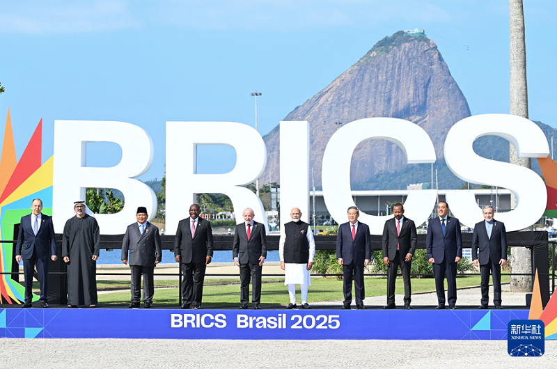 当地时间7月6日,国务院总理李强在里约热内卢出席金砖国家领导人第十七次会晤第一阶段会议,就“和平与安全、全球治理改革”议题发表讲话。这是与会领导人集体合影。新华社记者 李响 摄